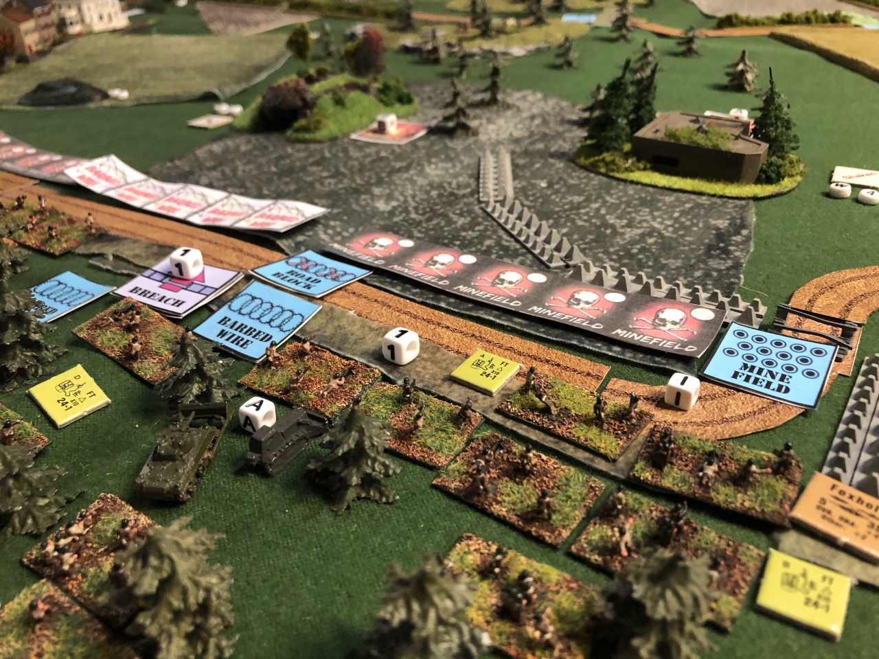 The closest commercial rules to my interests included “Command Decision”, “Clash of Armor”, “Spearhead”, and Kampfgruppe Commander.” In my opinion, these do a commendable job of capturing the command and operational basics of WWII combat. However, I was soon looking for a level of detail beyond these and began modifying or adding new rules. After retiring from my day job in the Department of Defense and the Navy Reserve, I had much more time to develop my own set of rules that I believe more accurately capture the feel of doctrine, operations, and tactics of the time. My rules (now 280+ pages) emphasize planning, command and control, training and experience, and morale; combine scouting, reconnaissance, and battlefield engagements to develop the intelligence picture; and have extensive artillery and engineer rules. I also have rules for combat in the Normandy hedgerows, built-up areas, and fortifications.